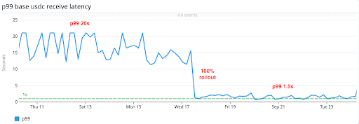 - 在Base上USDC接收延迟从20秒降至约1秒,降低了90%