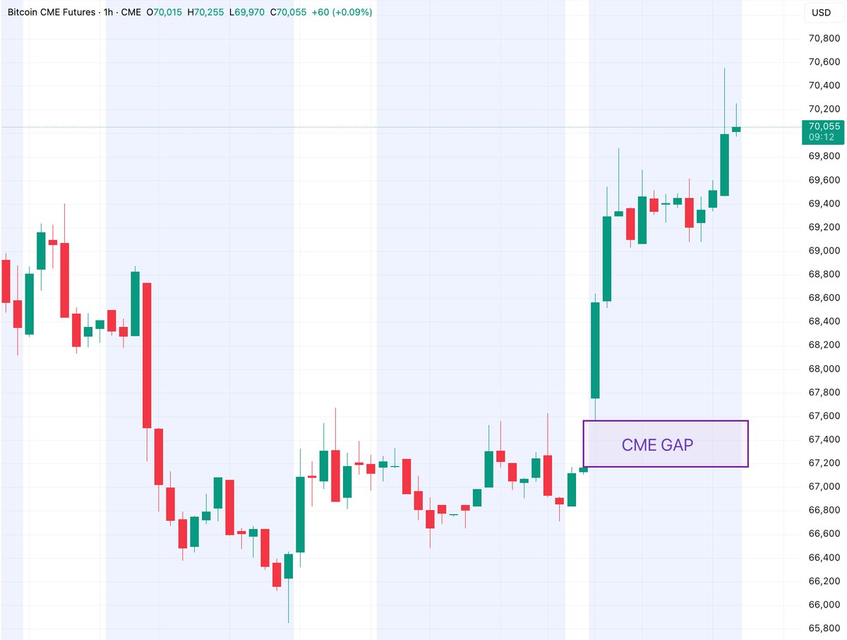 比特币在67,180美元至67,560美元之间形成了新的CME缺口。投资者正密切关注这一水平作为潜在的价格目标。CME缺口往往会在未来被填补。