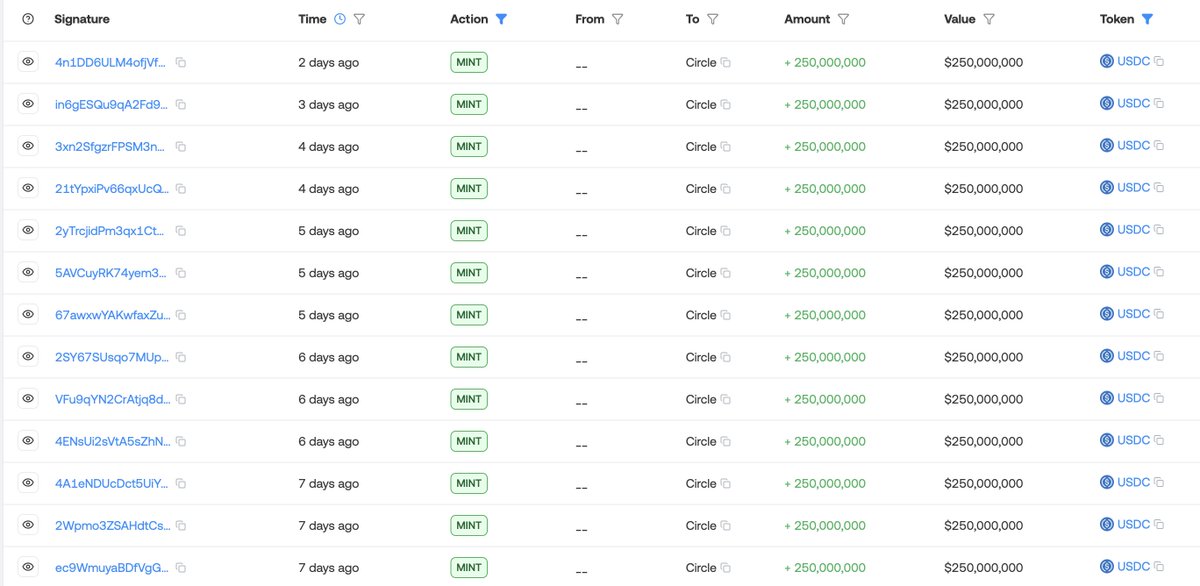Circle在Solana上过去7天内共铸造了32.5亿USDC。
