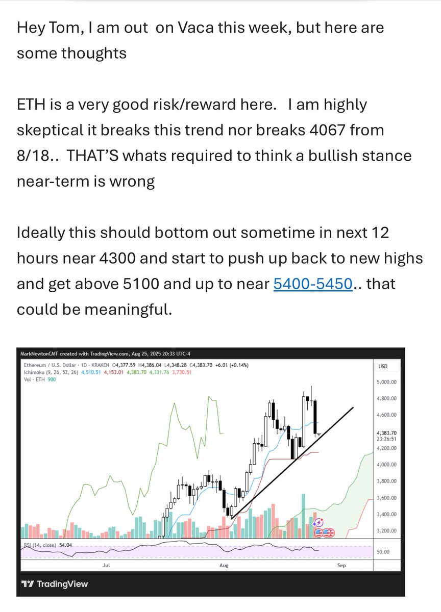 Mark @MarkNewtonCMT 再次出手。➡️预测 ETH 将在接下来几小时内触底。@fs_insight @FundstratCap Tickers: $BMNR $GRNY
