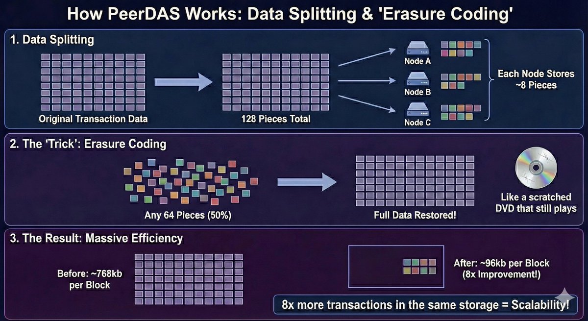 5. 运作原理:不再向全网每个节点发送完整交易数据,PeerDAS将数据分割为128份,向每个节点随机分配至少8份进行验证存储
