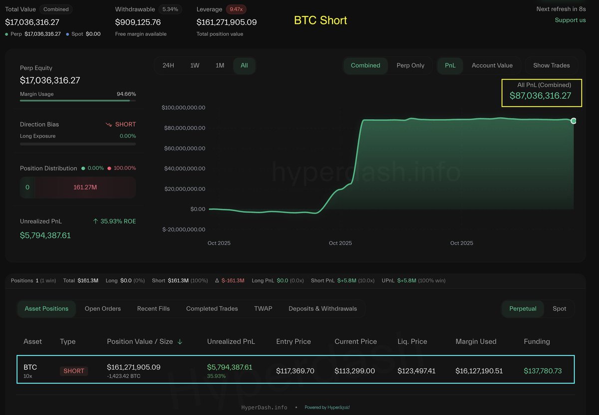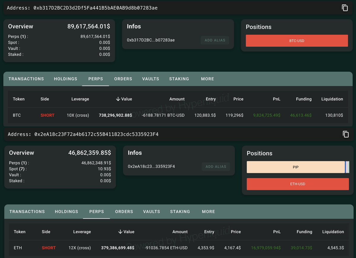 ⚠️ 主要 #Bitcoin OG 已使用其 $BTC 销售额中的 $110M 在 #Hyperliquid 上做空 $BTC 和 $ETH (总仓位:$1.17B;浮动利润:+$26.9M)