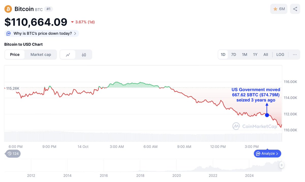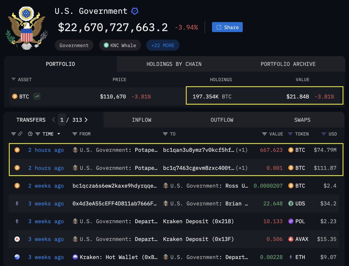 与此同时,2小时前,#USGovernment 将667.62 $BTC(7480万美元)从没收的Potapenko/Turogin资金转移到一个新钱包中。目前尚未有进一步动作,但 $BTC 自那以来已下跌1,420美元。