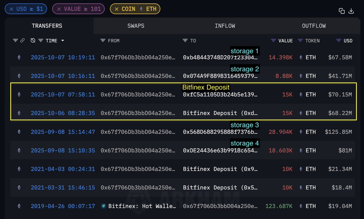 这条巨鲸在3小时前又向#Bitfinex存入了15,000 $ETH(7015万美元)。过去2天内,该巨鲸已以均价4612美元向交易所抛售了30,000 $ETH(1.384亿美元),并将23,278 $ETH(1.093亿美元)转移至2个新钱包。当前持有:70,785 $ETH(3.324亿美元)分布于4个钱包。关注@spotonchain 随时追踪这条巨鲸的更多抛售活动!