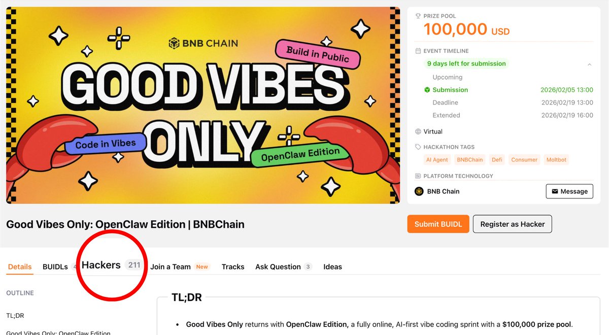 超过200名黑客正在#VibingOnBNB并加入了Good Vibes Only黑客马拉松!🦞