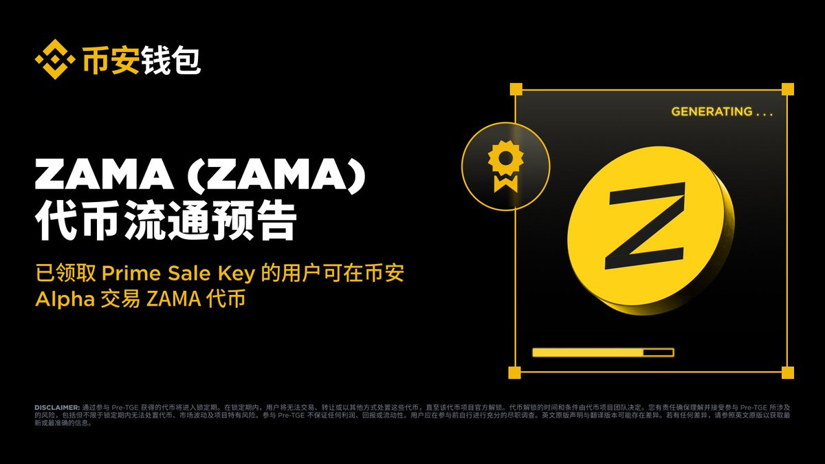已领取 Prime Sale Key 的用户届时可在币安 Alpha 账户查看余额并交易 ZAMA 代币。