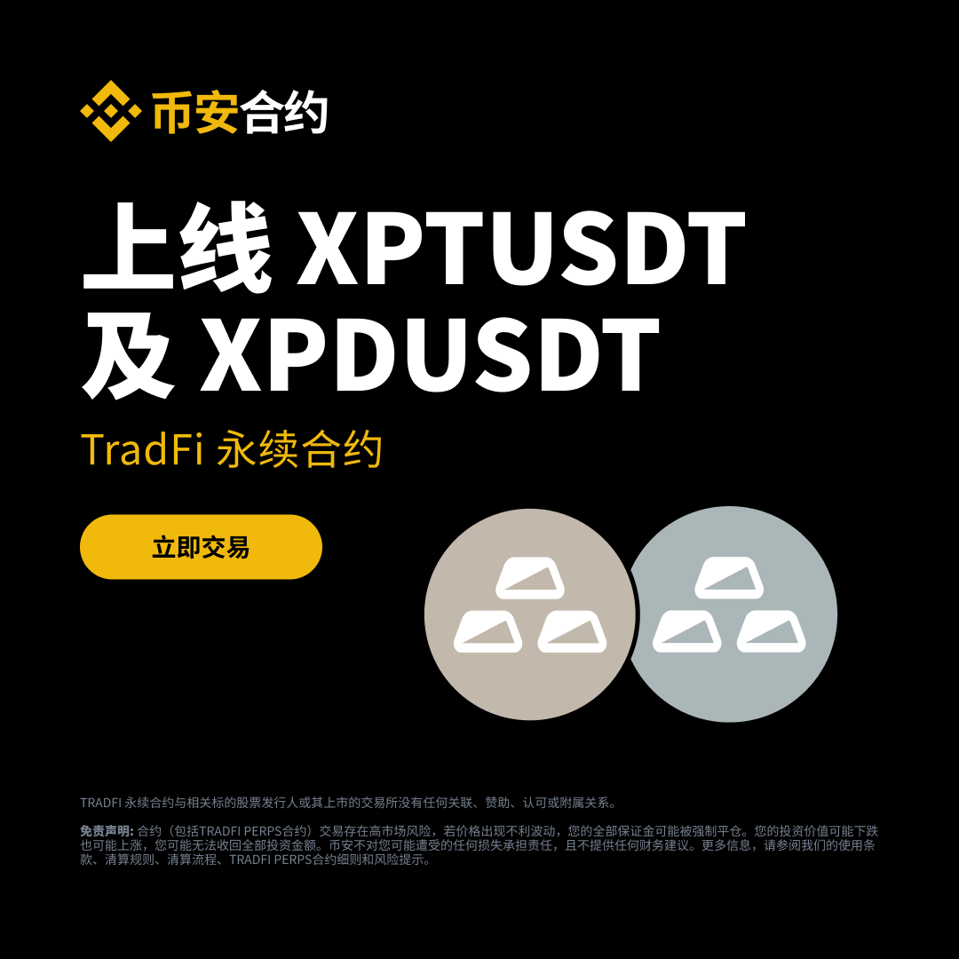 币安合约将于 2026 年 1 月 30 日 18:00 和 18:15 东八区时间 上线 XPTUSDT 及 XPDUSDT 永续合约。
