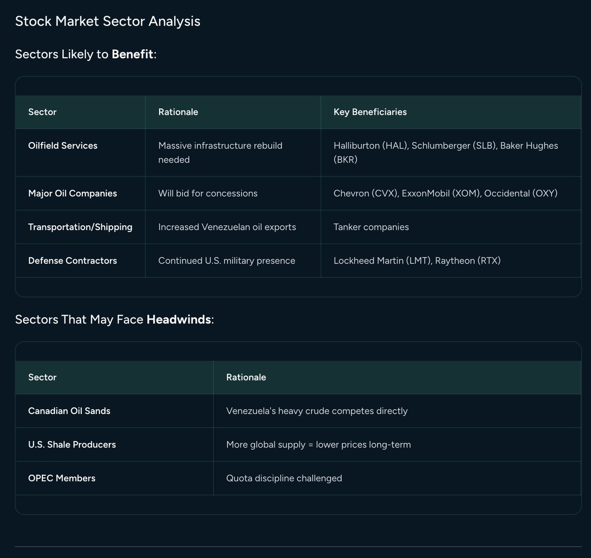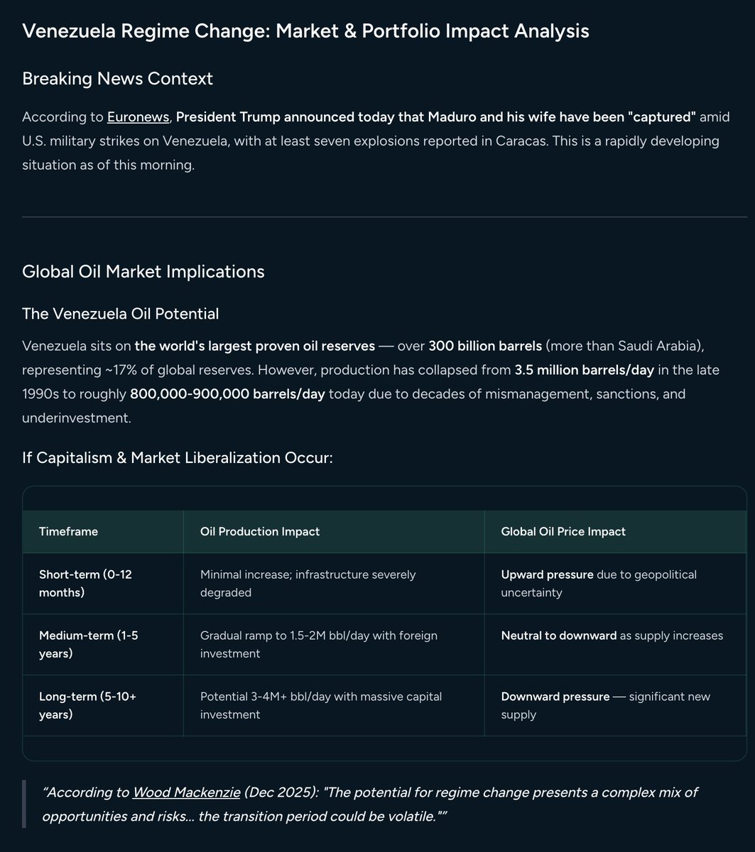 “如果委内瑞拉在Maduro被捕后拥抱资本主义,并且该国的自然资源如石油被释放到全球市场,这将如何影响股市和我的投资组合?”