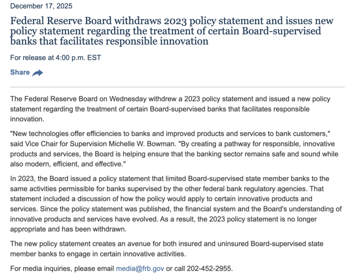 🇺🇸 最新消息:美联储刚刚撤销了其2023年的政策,为在其监管下的无保险和有保险银行参与加密活动打开了大门。