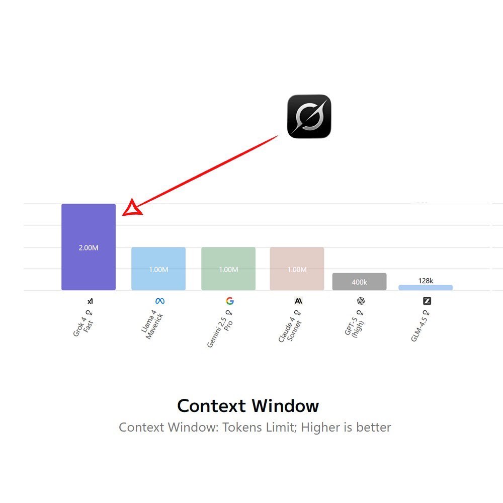 Grok-4 Fast 在AI领域设立了新标杆,拥有2,000,000 token的上下文窗口,是Claude、Gemini和Meta的两倍,是ChatGPT的5倍。