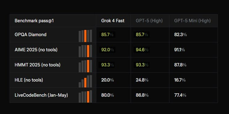 这个周末遇见了一些开发者…他们还不知道Grok 4 Fast..Grok 4 Fast是一个颠覆者:它拥有史上最高的智能密度——超越顶级模型超高性价比:比替代方案便宜高达98%超快输出=更高生产力,更少等待疯狂的是这还没有成为主流如果你不使用Grok 4 Fast,你就是在浪费时间和金钱Grok 4 Fast提供GPT-5(高级)性能——只需5%的成本(便宜95.7%)...疯狂的价值Grok 4 Fast成本-输入令牌:便宜84%-输出令牌:便宜95%-输出速度:快150%GPT-5:1.25美元/M输入,10美元/M输出Grok 4 Fast:0.20美元/M输入,0.50美元/M输出Grok:344令牌/sGPT-5:~138令牌/s让他们知道...如果说有什么,Grok 4 Fast的价值仍然被低估