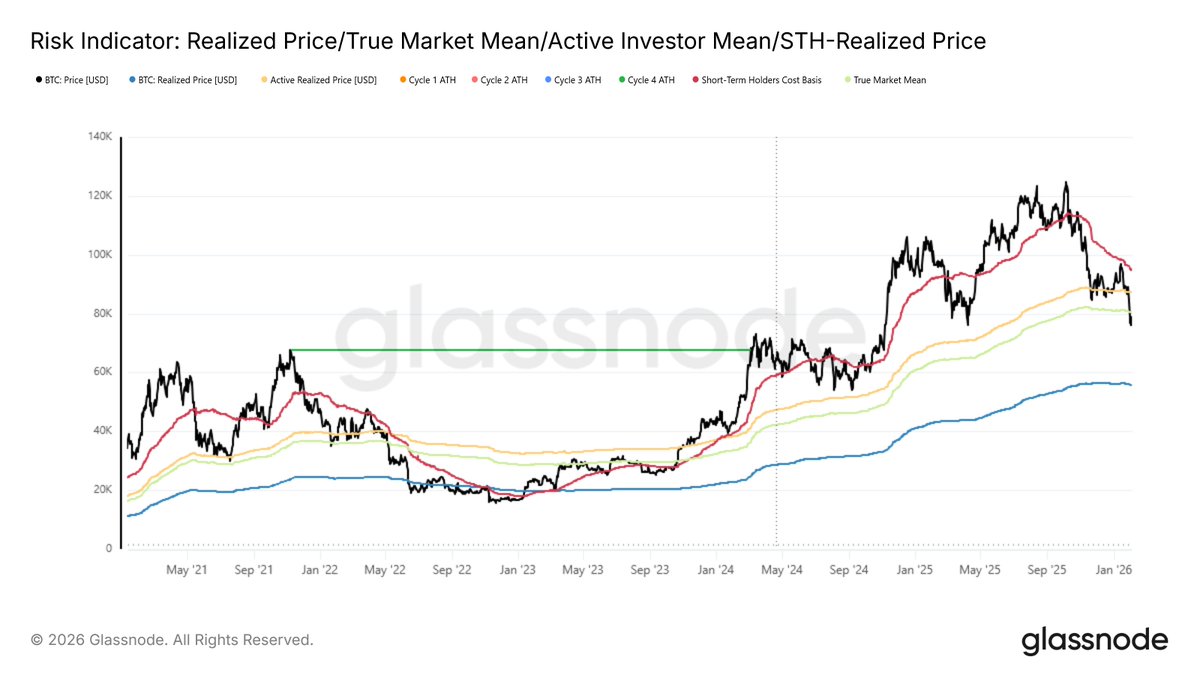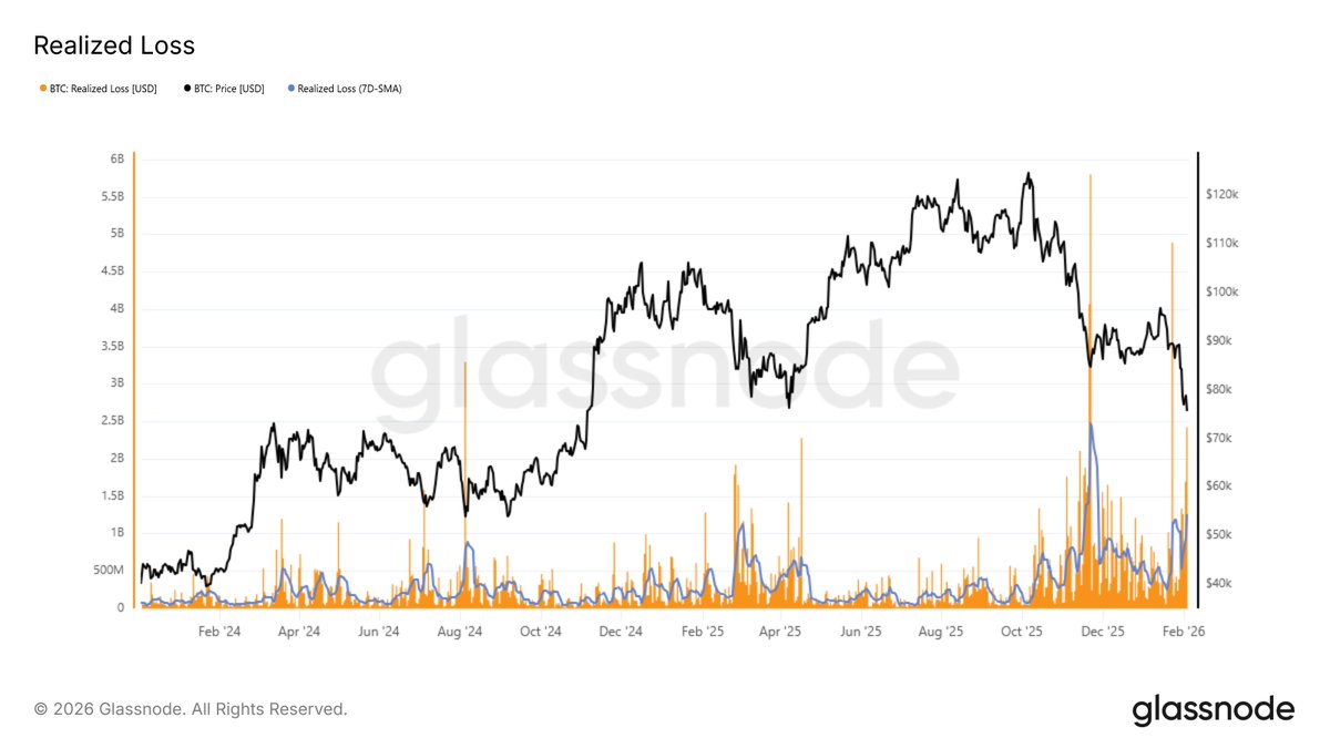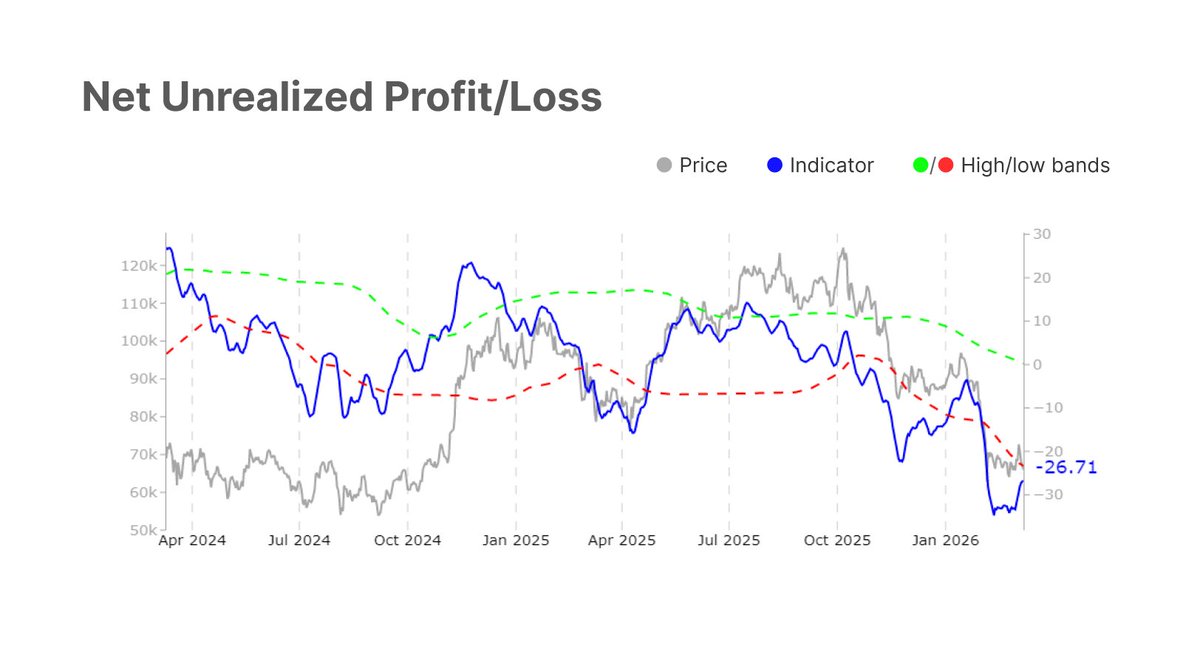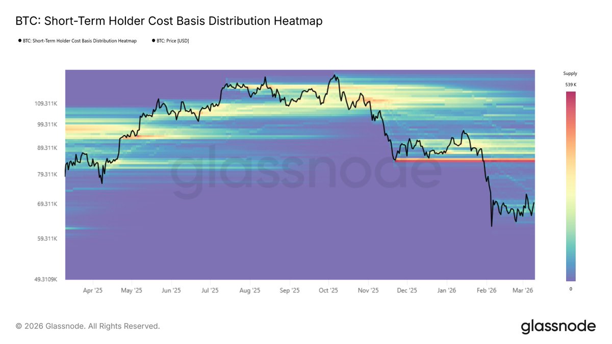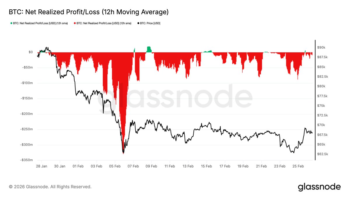 每当净实现盈亏的12小时简单移动平均值飙升至每小时$5M以上时,价格就会在$69.4k的高点区域停滞并反转。这个区域继续压制每一次复苏尝试。这种不对称性反映了当前需求结构的脆弱性。