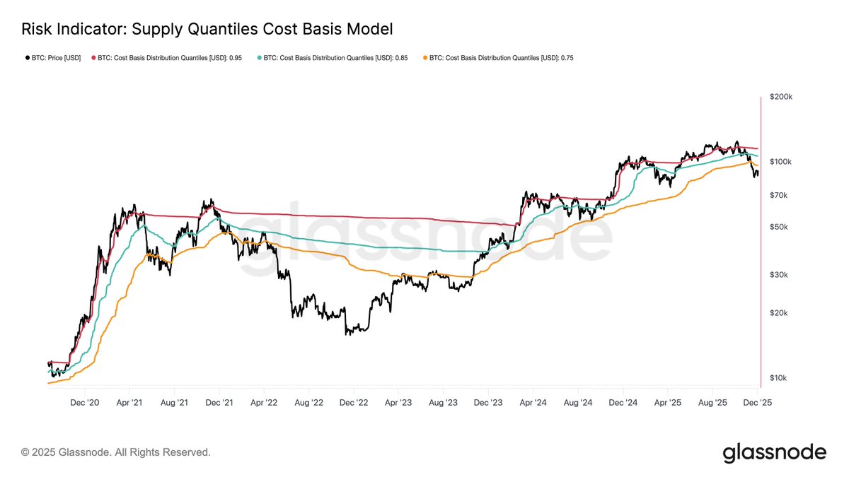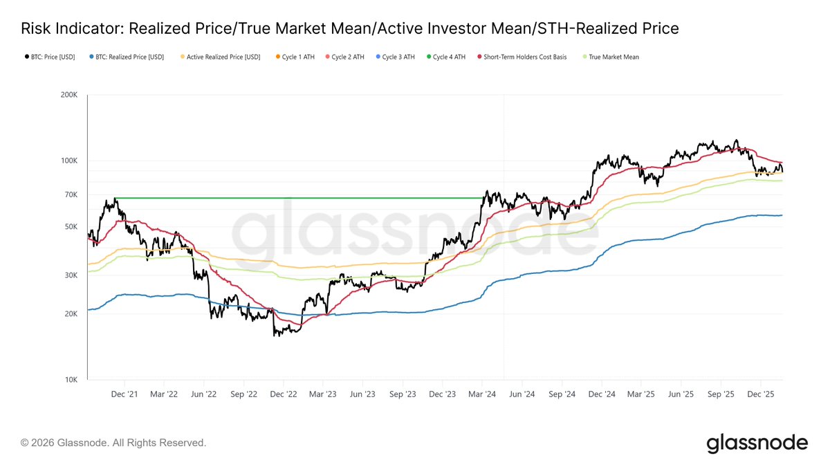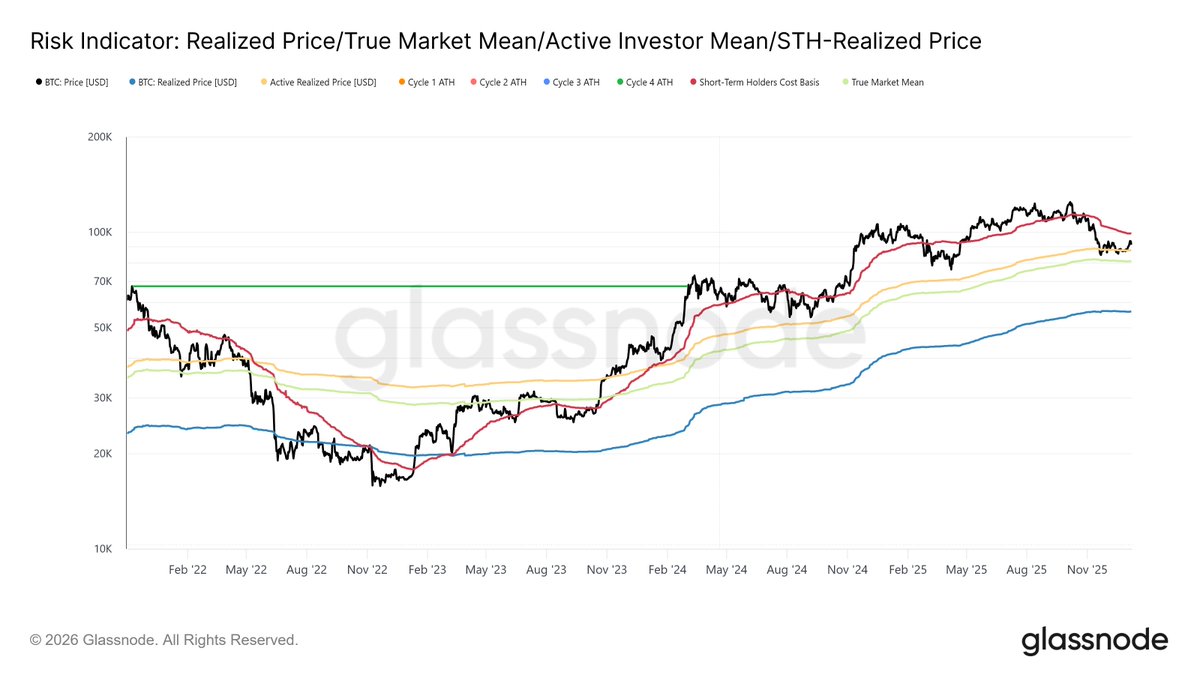 现货价格仍在 $90.2K 附近交易,关键链上价格模型未发生显著变化: