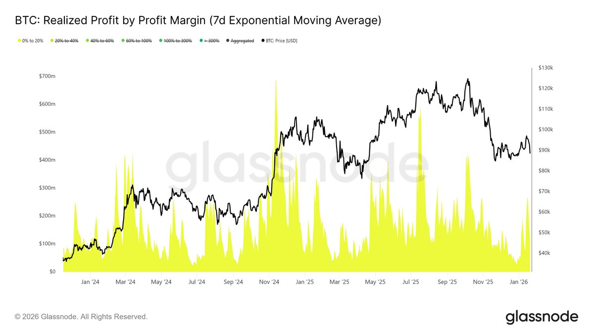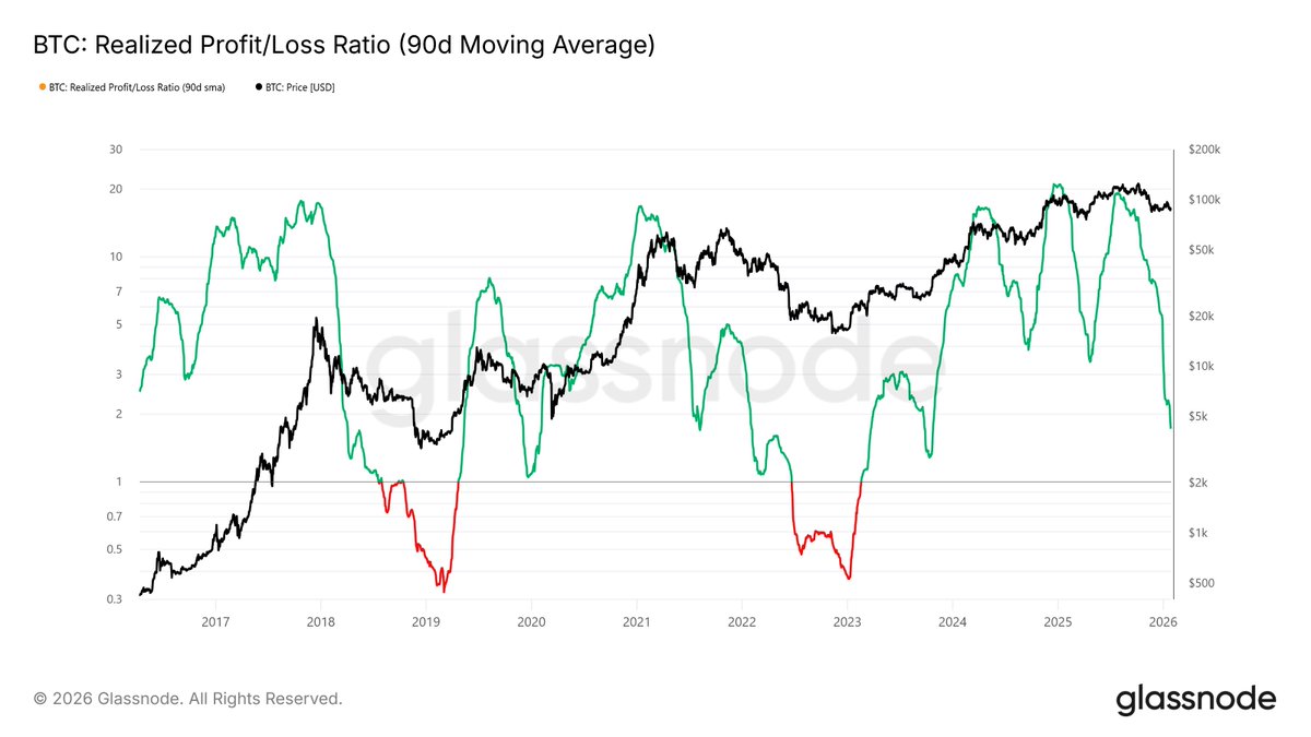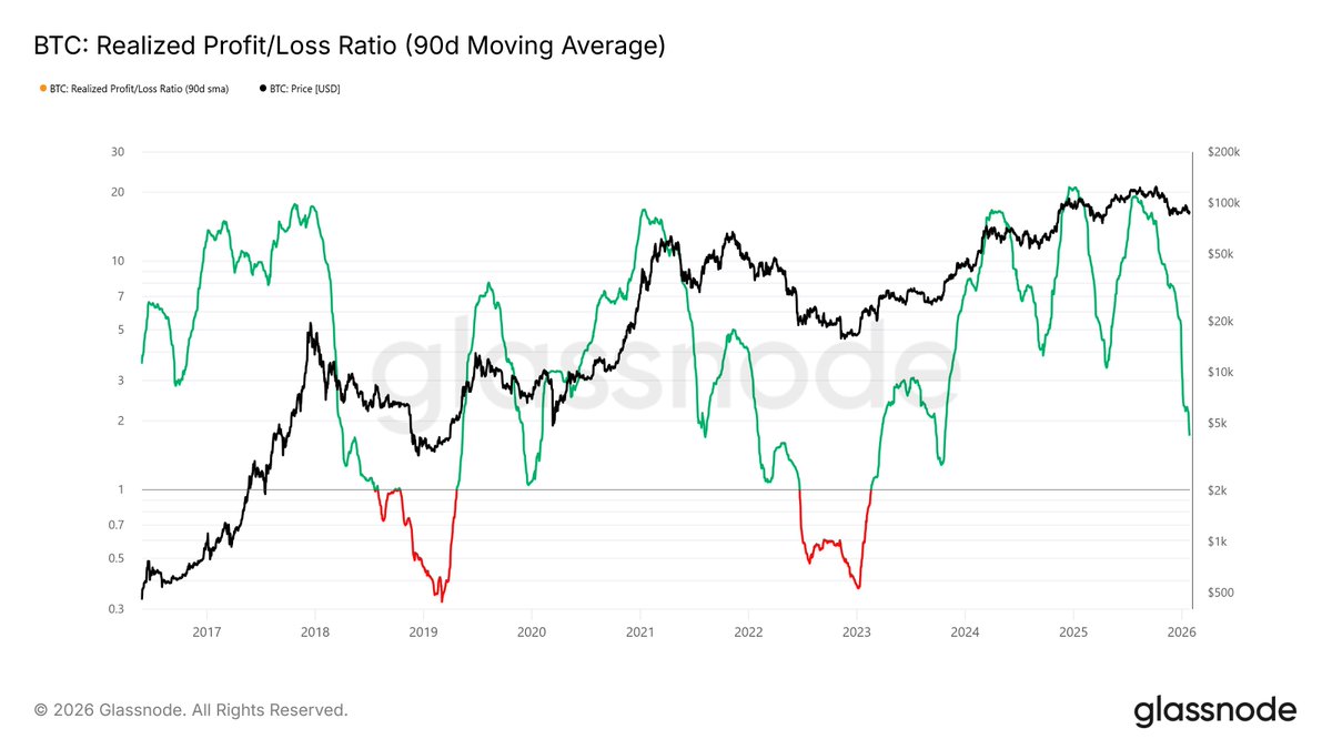 90日移动平均实现盈亏比率从2025年7月的峰值19暴跌至如今的1.7。这一急剧下降预示着市场需求的重大转变和投资者日益增长的挫败感。