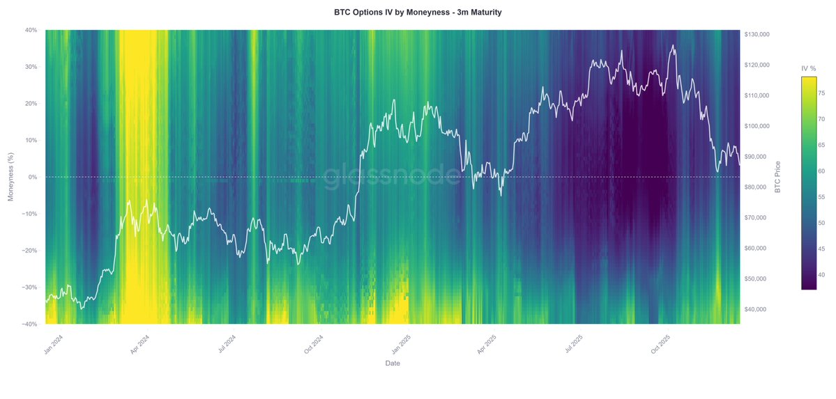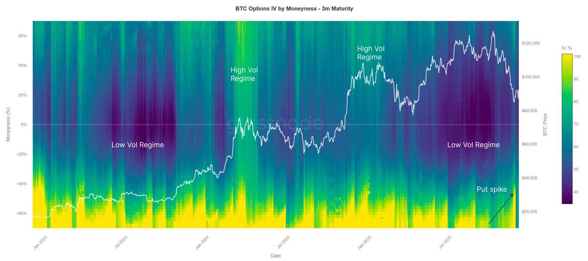 在几周前的急剧下跌期间,风险对冲活动增加,随着价格跌入低-$80K范围,看跌期权需求上升。这与预期价格分散度的上升同时发生,表明不确定性增加。