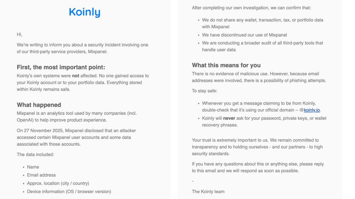 🚨 最新消息:加密货币税务软件Koinly披露了一起由第三方服务提供商漏洞导致的潜在电子邮件地址泄露事件,并向用户保证其未与Mixpanel共享任何钱包、交易、税务或投资组合数据。
