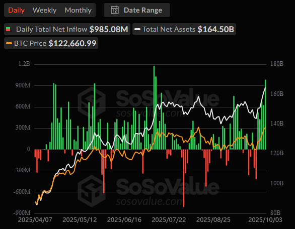 大资金无法停止买入。👀 #BITCOIN ETFs昨天增加了$985M。连续5天流入。