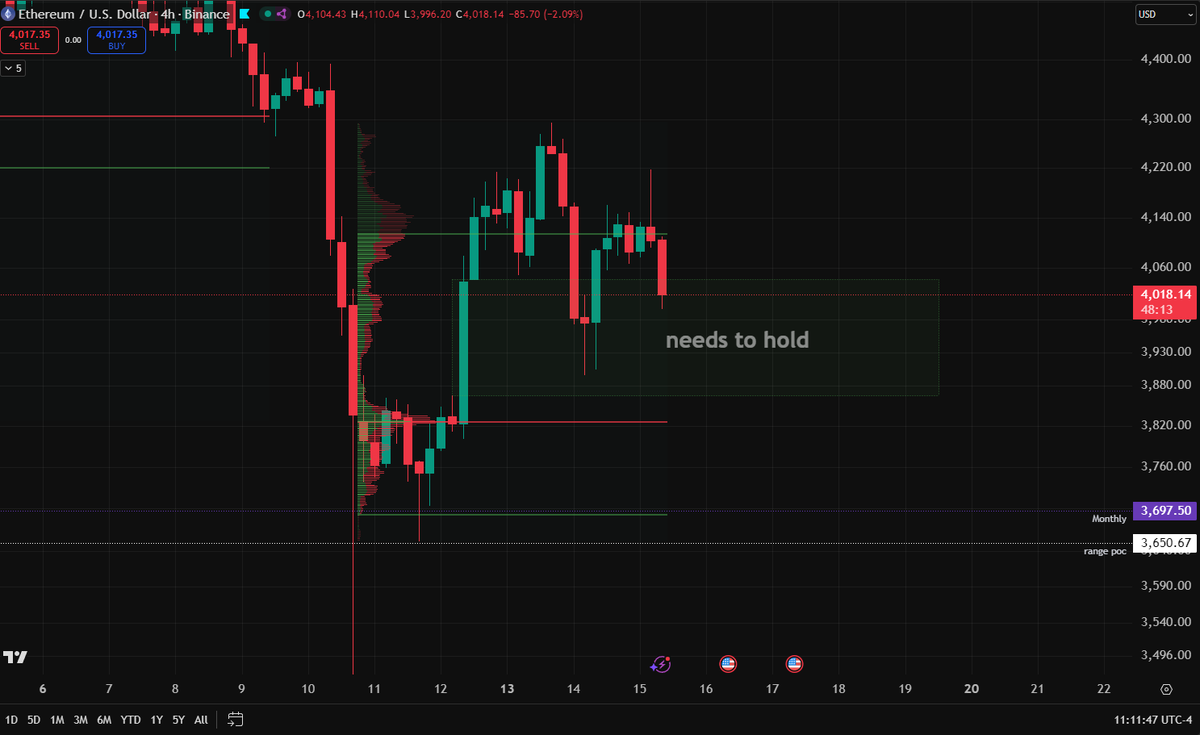 $ETH在区间POC上方被拒绝——需要守住$4K,否则我们将跌至$3,800–$3,400。多头防守!