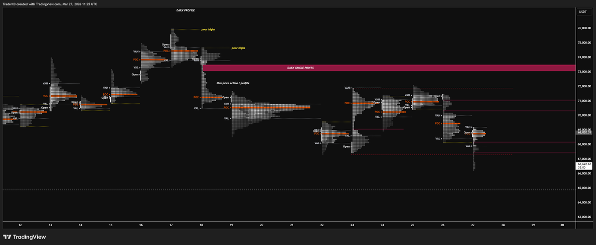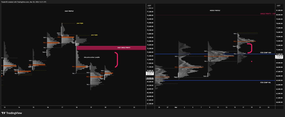 如果未来几周我们看到进一步上涨,80–82k区域将成为重要阻力位,与2月高点及单点打印重合,通常会有一个均值回归的反弹行情回到12/21/25周EMA带。如果从订单流的角度看条件成熟,我可能会考虑在那里卖出。