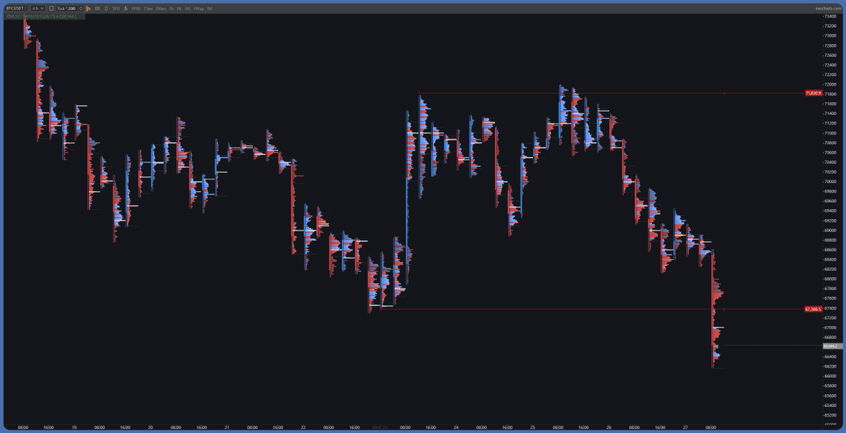 在日线图上,12/21/25 EMA在70k–69k附近是关键支撑位,与4周综合价值区域高点重合,理想情况下我希望看到这一区域能守住。如果价格跌破这一关键水平,我可能会倾向于认为价格会测试2月低点,甚至可能跌至58k附近或接近前期低点。如果这些水平能守住,我会对区间交易的多头感兴趣——前提是条件成熟。