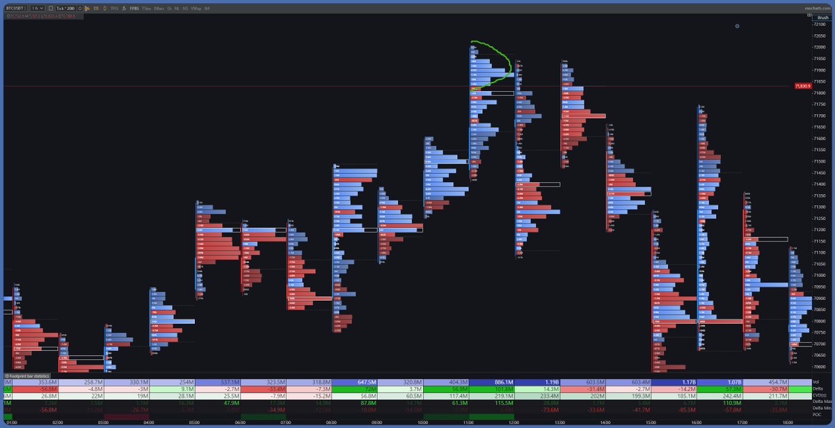 通过市场概况背景和订单流分析核心比特币交易设置,追踪关键水平的参与度、失衡和反应。