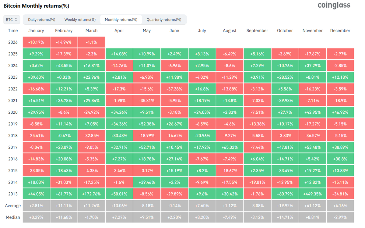 如果3月以负收益收盘,这将是比特币第二次记录到连续6个月的下跌:从2025年10月到2026年3月