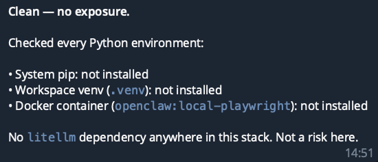 如果安装了litellm,大家应该迅速行动.. opsec paranoid再次获胜 😂 我们的主代理在本地模型上运行以进行任务编排和模型路由,因此没有外部路由器依赖 🙏