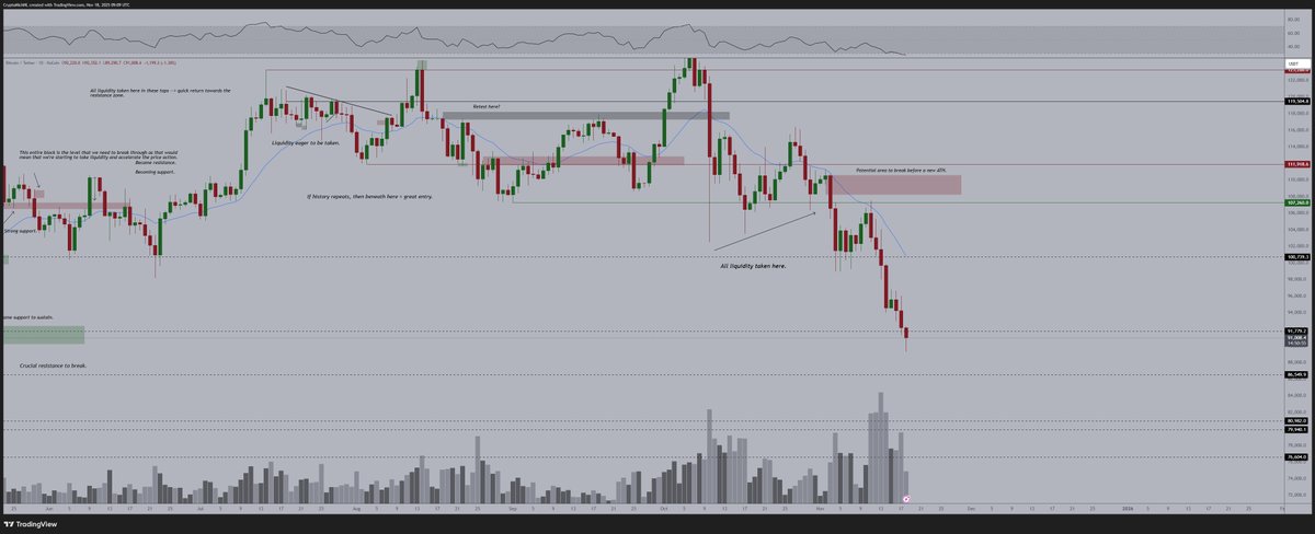 值得注意的是,所有流动性都在下行方向被吸收对于#Bitcoin。甚至低于$92K。CME缺口已经闭合。恐惧与贪婪指数跌至11,这是自Luna崩盘以来的最低水平。这也是为什么情绪如此糟糕。我不知道这是否是低点还是它会跌至$85K,但论据正在形成。从技术角度来看,20日均线对比特币当前价格的差距巨大,历史上只发生过几次。周线图也是如此。这本身就应该预示着至少反弹至$95-100K。我期待什么?好吧,我并不认为我们会V型反转向上,我确实预计在继续上涨之前会有一段时间的盘整。然而,这是四年周期信徒将被淘汰的洗牌阶段。