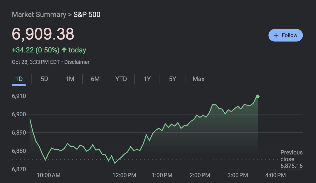 最新消息:🇺🇸 标普500指数首次突破6900点,自2025年4月低点以来增加了18万亿美元市值