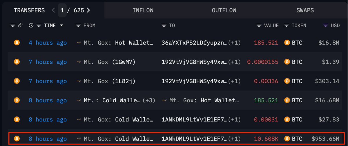 ‼️ 最新消息:在8个月的不活跃后,Mt. Gox将10,608 #Bitcoin 价值 $953 million 转移到一个新钱包中。 Mt. Gox仍持有34,689 Bitcoin 价值约 $3.14 BILLION