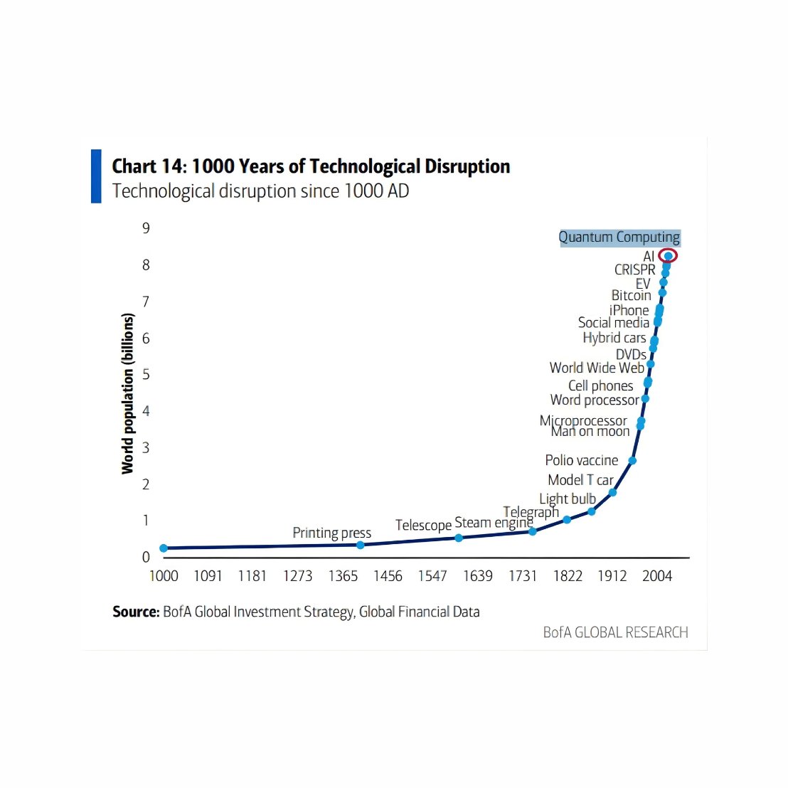 美国银行将比特币列入其1000年人类历史上最具颠覆性创新的图表中。与印刷机、蒸汽机、电灯泡和互联网同列。而它才17岁。你并不晚。