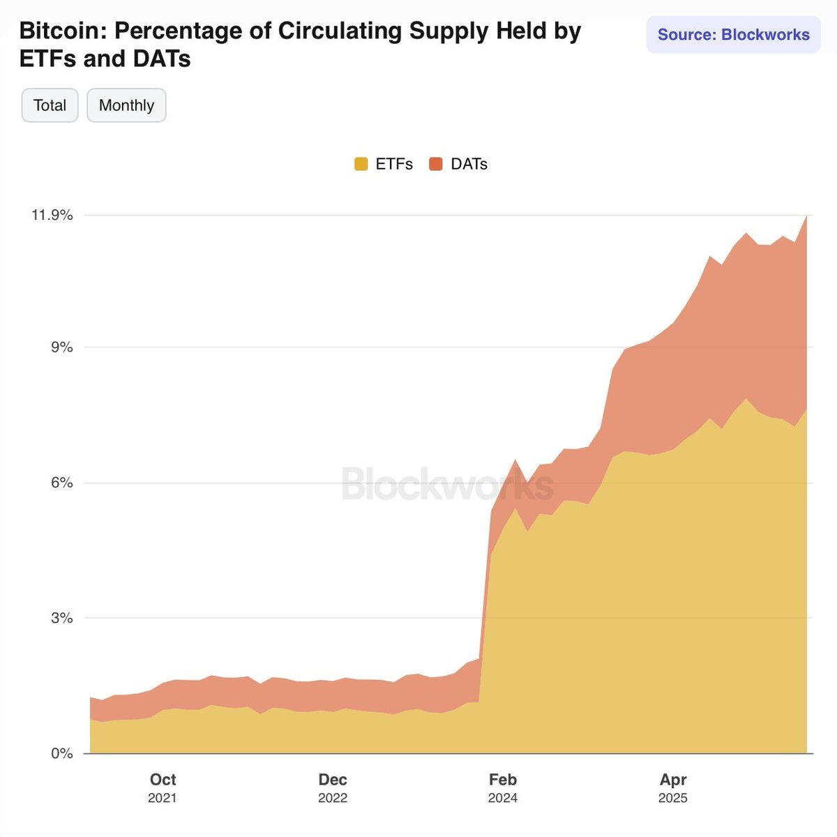 ETF和数字资产国库现在持有近12%的比特币流通供应量。传统金融正在锁定比以往更多的BTC。