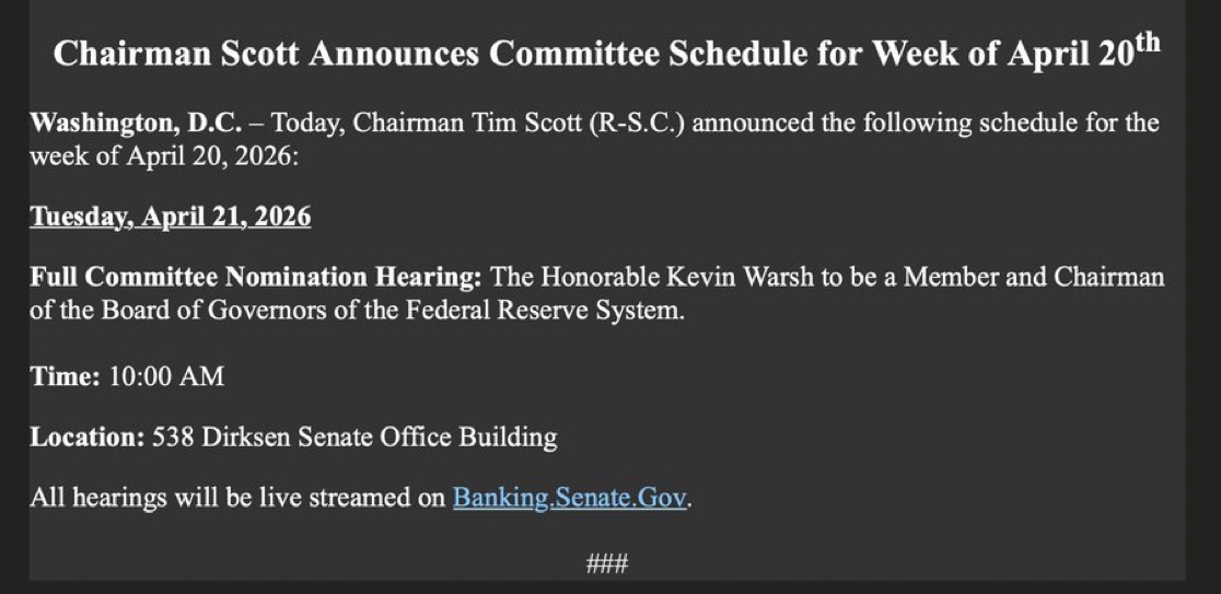 CLARITY ACT未被列入参议院下周的议程。没有关于CLARITY ACT的听证会。4月21日只有一项美联储提名。加密法案本应在4月20日截止日期前出台。为何延迟?