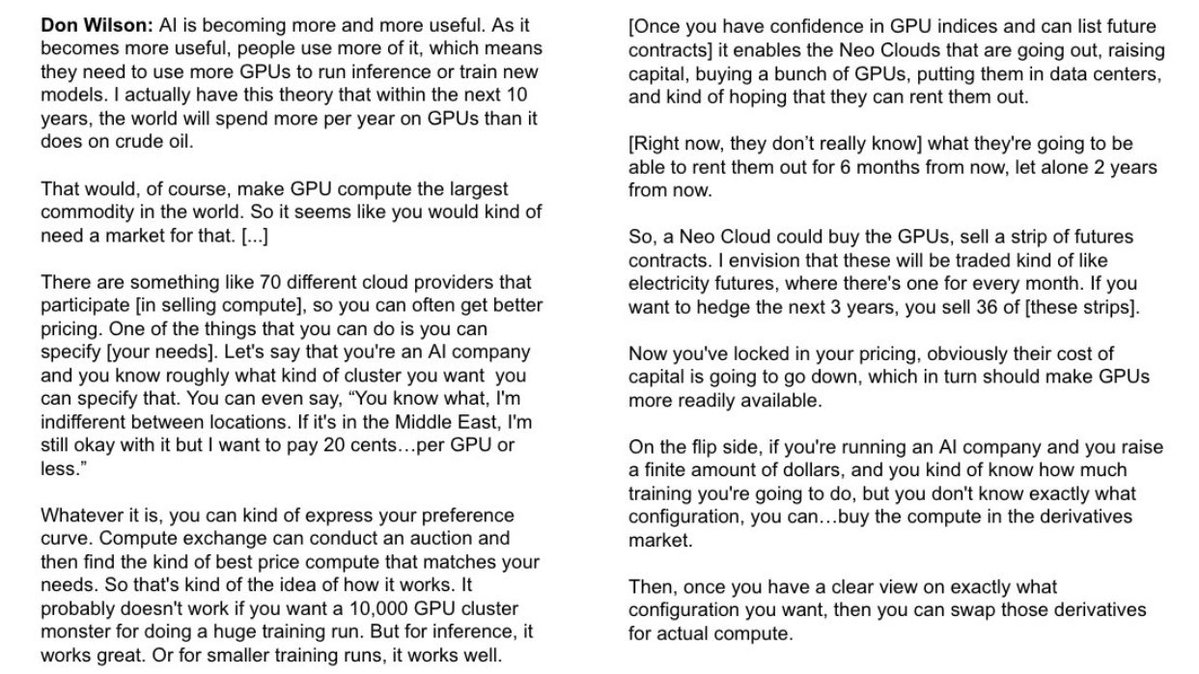 芝加哥自营交易公司DRW的创始人表示,计算能力将在10年内成为全球顶级商品。人们将在GPU上的花费超过石油,这意味着应该为GPU建立一个期货金融市场。对初创企业和云服务提供商来说,这带来了有趣的启示: