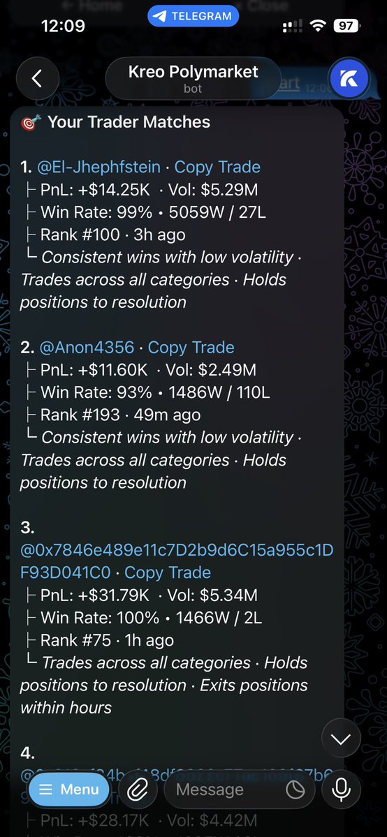 你可以通过@kreoapp复制他的交易
