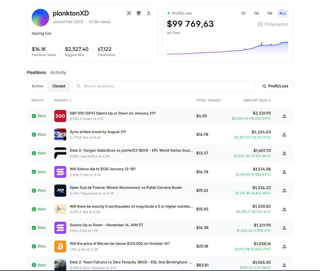 一位用户在Polymarket上使用机器人将1000美元变成了约10万美元的利润