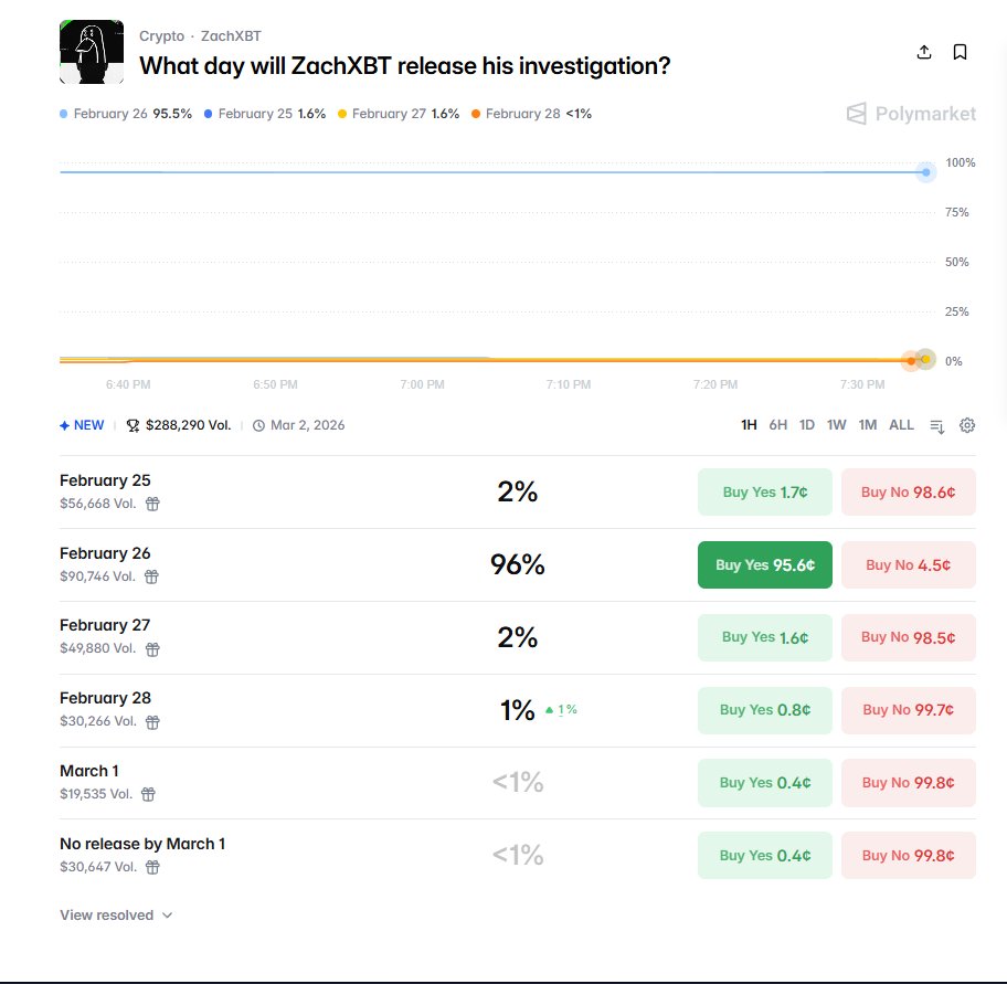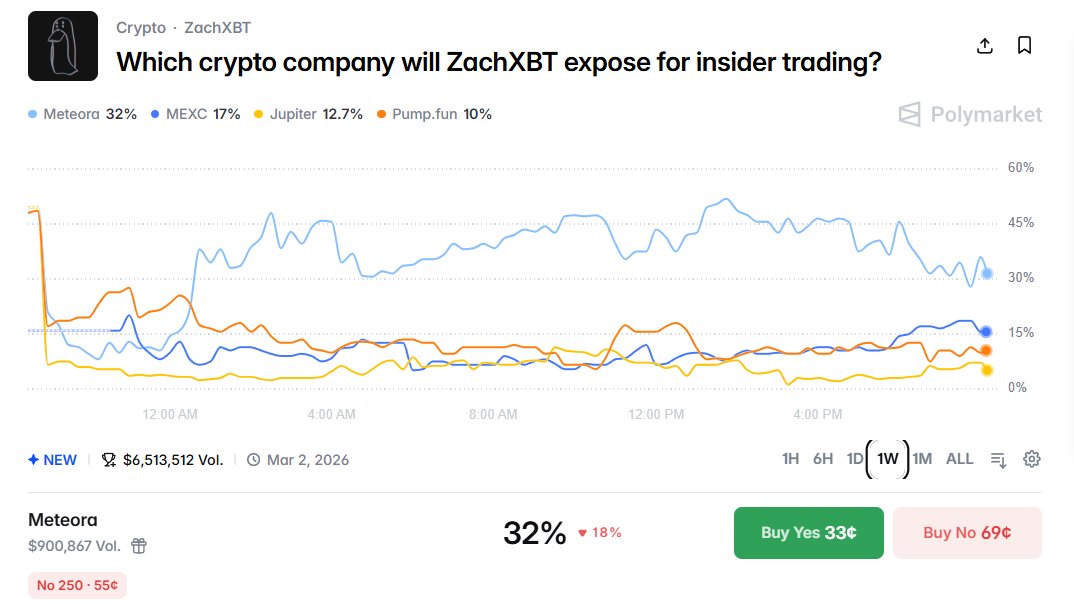 meteora仍然看起来定价过高,个人观点如此。最近有帖子声称ZachXBT在polymarket上创建了一个账户,并内幕押注他的调查将涉及meteora。完全没有证据,纯粹是刷互动。但群众还是把meteora推高到了50-52%。我的限价单没有全部成交,所以没能建大仓,但还是买了一些NO股份。我认为即使在当前水平也有不错的入场机会。顺便说一句,mexc上升到了第二位,开始获得势头。等不及2月26日了。非财务建议,自行研究。
