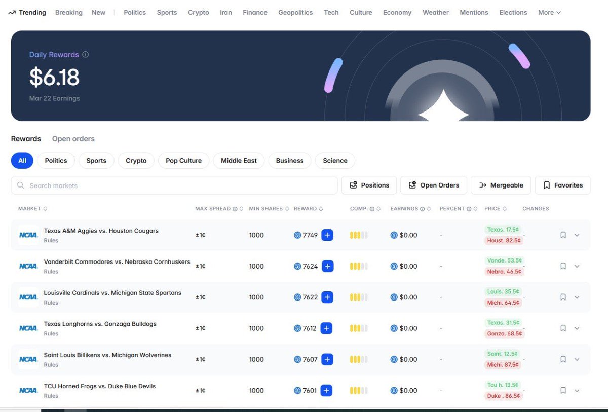 在@Polymarket上,你可以通过提供流动性赚取USDC——只需在指定范围内下一定最小份额的限价单