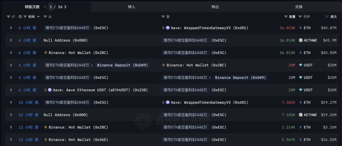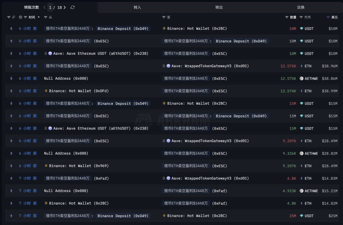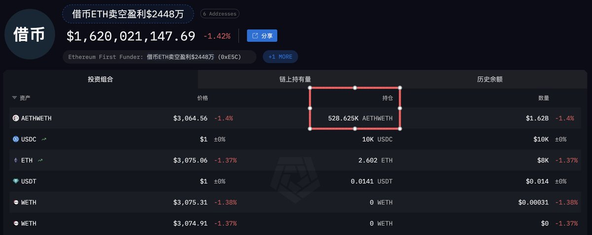 这个巨鲸/机构目前已通过循环贷方式在三周时间里囤积了价值 $2.3 亿的 $WBTC 和 $ETH 。 ◎1,356.8 WBTC,价值 $1.49 亿,均价 $117,556; ◎18,454 ETH,价值 $8106 万,均价 $4,415。 因为有通过循环借贷加杠杆,他在 Aave 上的借款也高达 $1.14 亿。