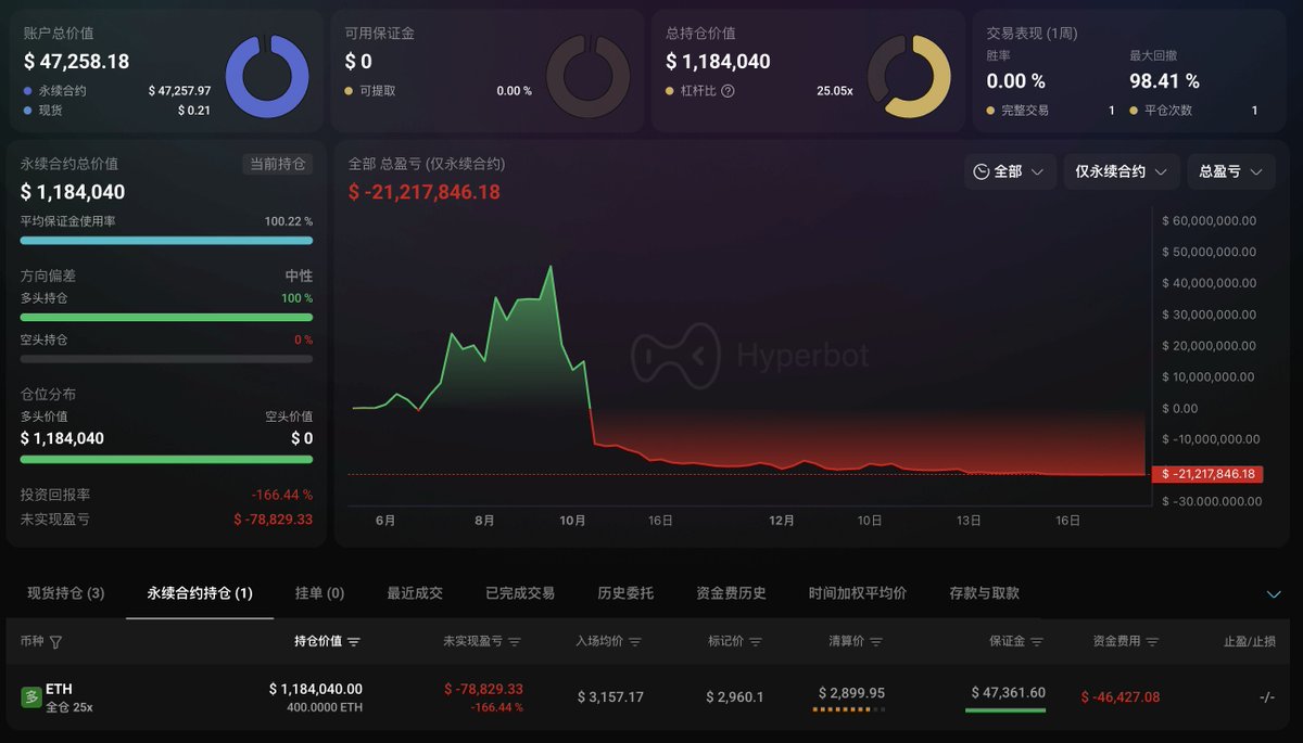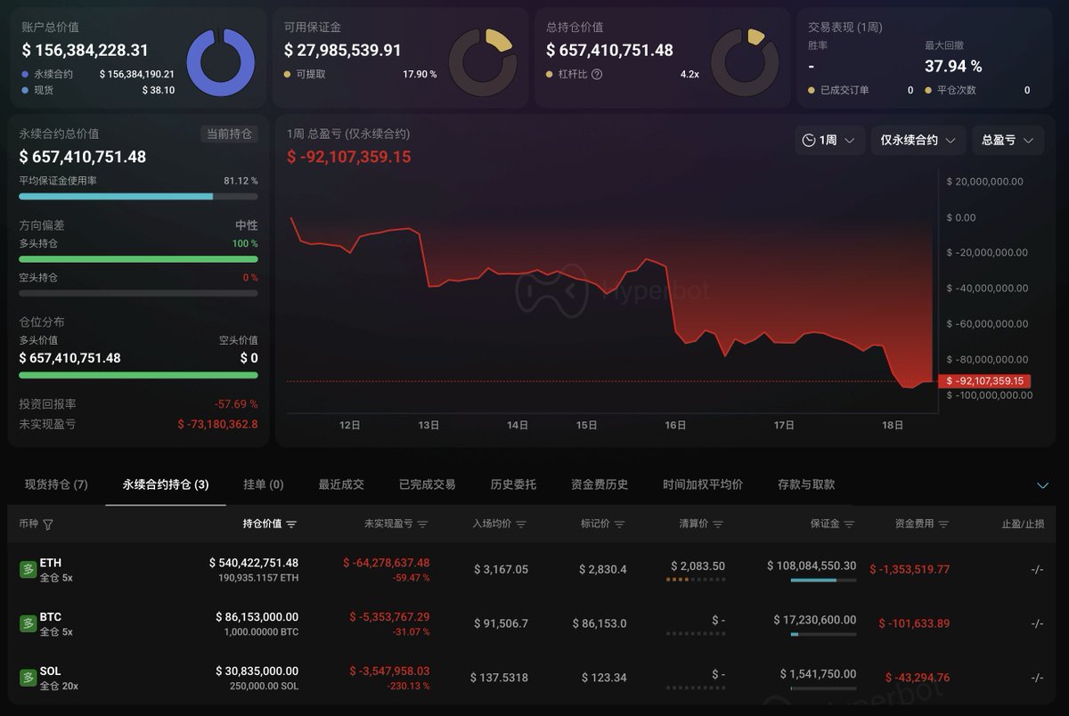◎19.1 万枚 ETH ($5.4 亿) 多,开仓价 $3,167,浮亏 $6428 万,清算价格 $2,083;