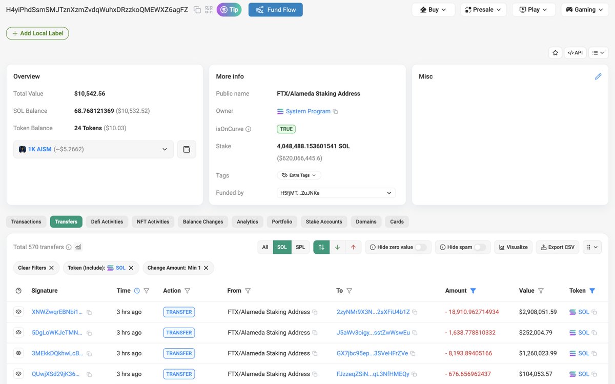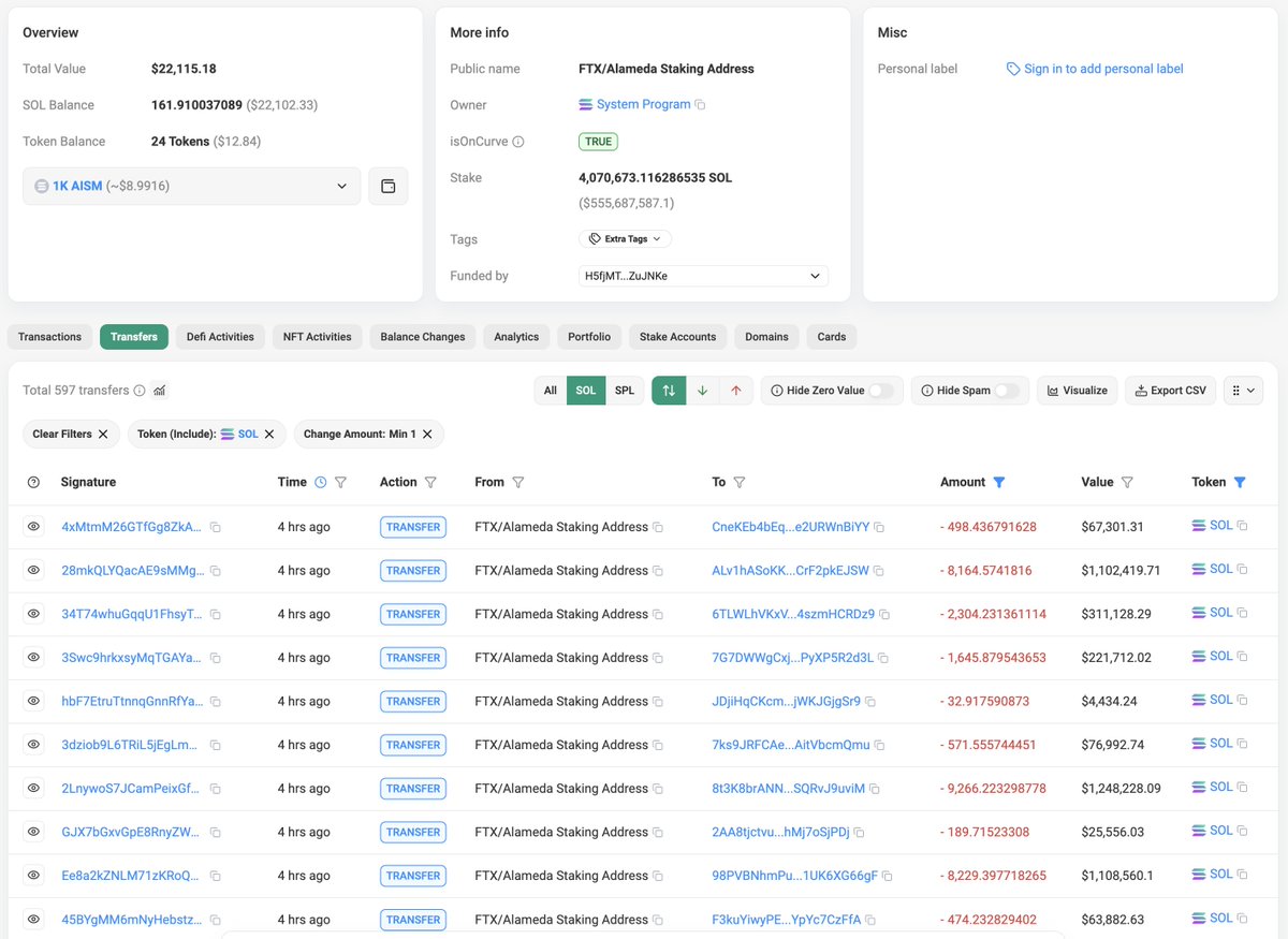 目前 FTX/Alameda 质押地址还有 441 万枚 SOL ($8.9 亿) 在质押中。