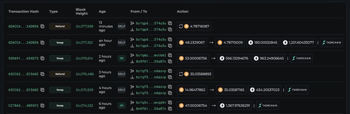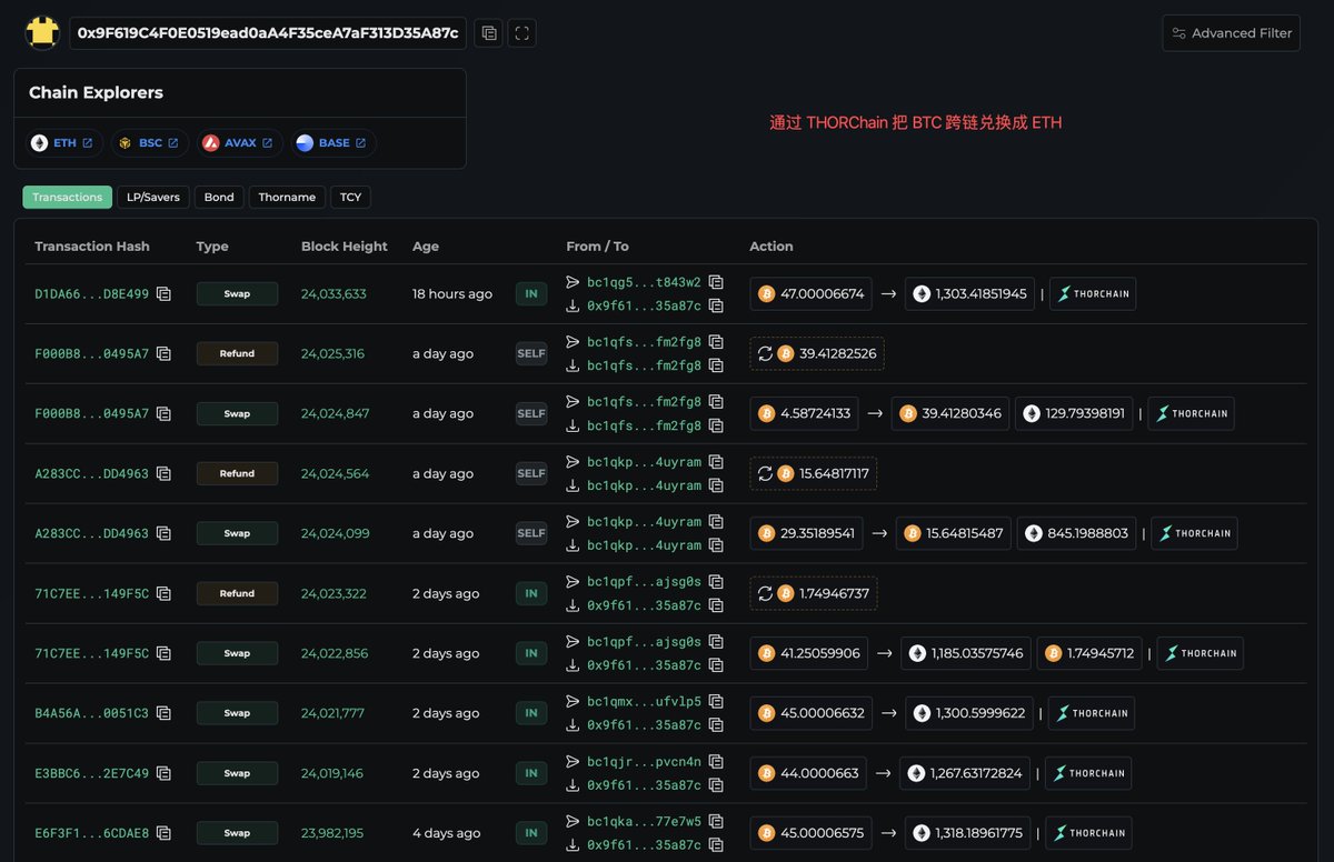 一个巨鲸/机构在过去半个月时间里,通过 @THORChain 把 1,469 枚 BTC 跨链兑换成了 43,647 枚 ETH ($1.31 亿),兑换的 ETH 均价在 $3,000。