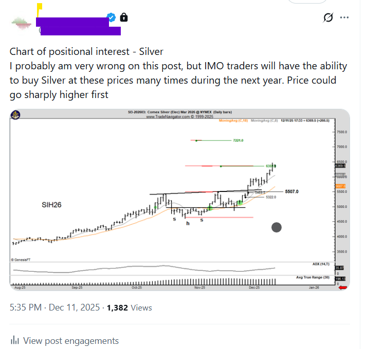 2025年12月11日,我在我的私人“无喷子”X社区成员中写了这篇文章。当时我在低$50s时做多$SI_F期货。我的目标是中$70s,我担心我的成员会FOMOing。最终我提高了目标,于1月12日在89.02平掉了最后的多头仓位。