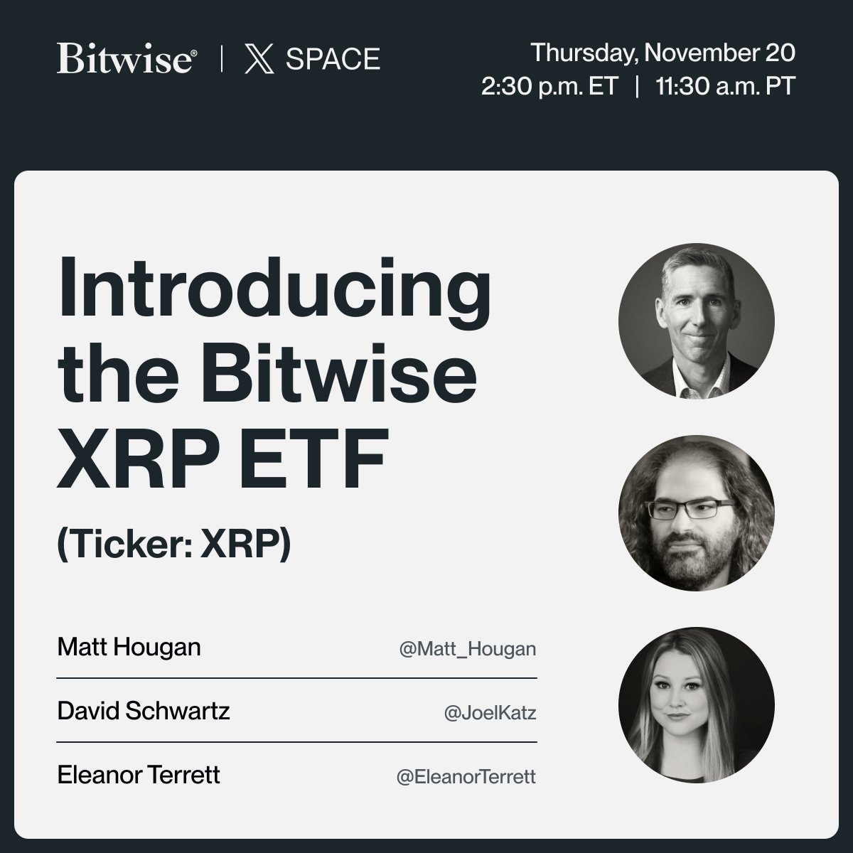 为了纪念这一历史性时刻,我们将与@JoelKatz和@Matt_Hougan一起举办一场X Space直播,由@EleanorTerrett主持。