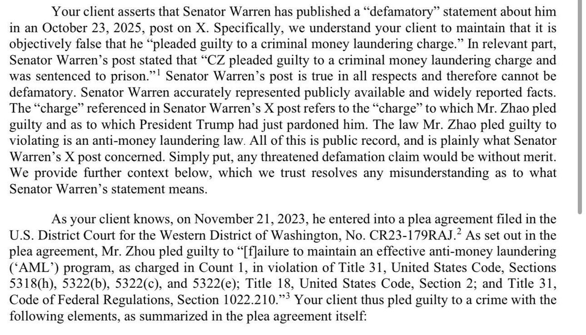 新闻:我们今天收到了参议员伊丽莎白·沃伦(马萨诸塞州民主党人)律师的一封信,以回应币安创始人赵长鹏的诽谤威胁。