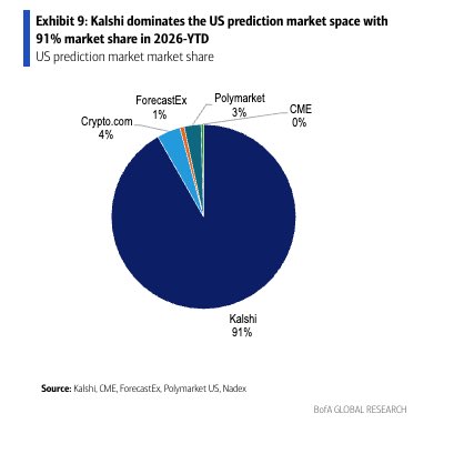 美国银行的研究指出,Kalshi的周交易量在过去一年中急剧上升。该平台现在占据了美国预测市场91%的份额。值得注意的是,根据同一分析,Crypto.com的份额超过了Polymarket。