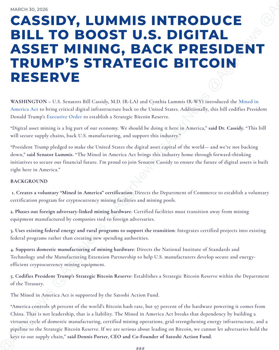 参议员卢米斯将提出两党合作的"美国开采法案",该法案促进在美国的BTC挖矿,包括矿工向政府出售以获得资本利得税减免:PR