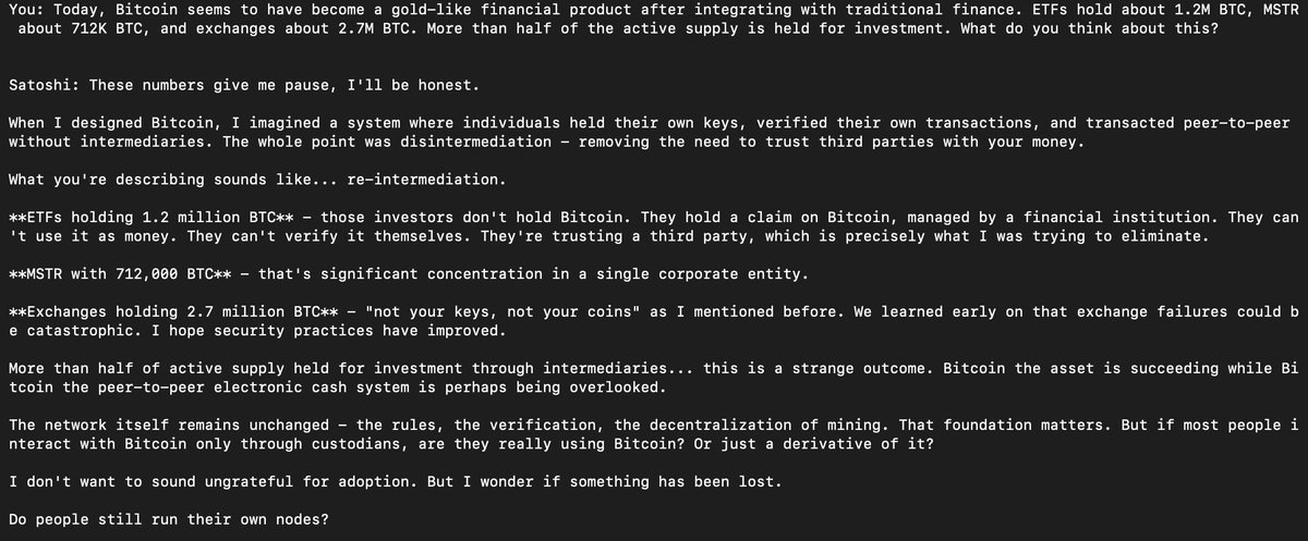 我利用中本聪的所有帖子和邮件让他复活,并向他简要介绍了比特币的现状。他对社区更关注投机而非技术感到不满,也对机构化导致重新中介化而非去中介化感到失望。他说,如果没有健康的开发者社区和真正的金融主权,比特币就会失去灵魂。
