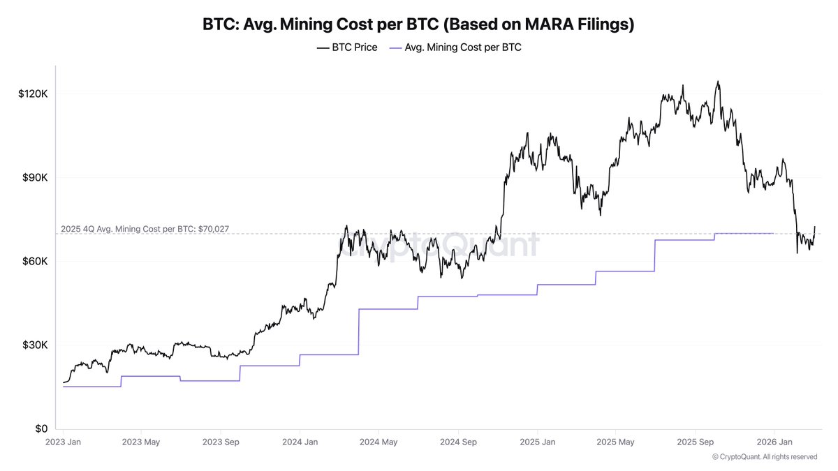 根据最新的MARA文件,比特币挖矿成本为每枚BTC $70,027。
