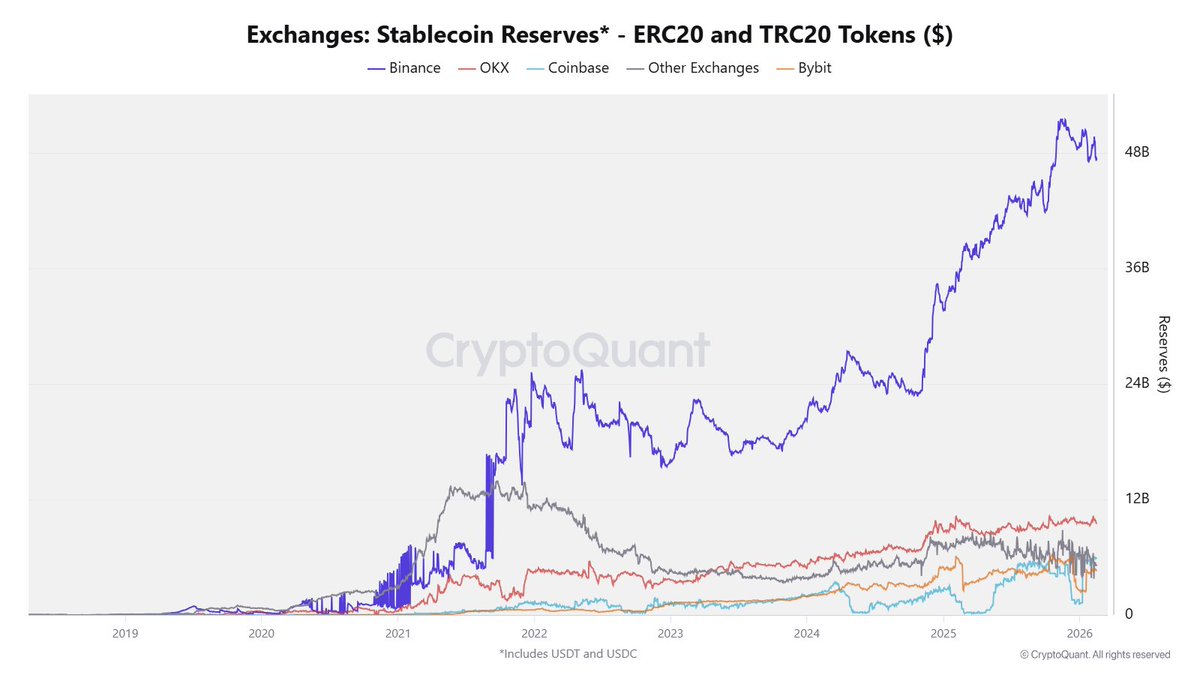 475亿美元的USDT和USDC储备现在存放在币安,占所有CEX稳定币的65%。
